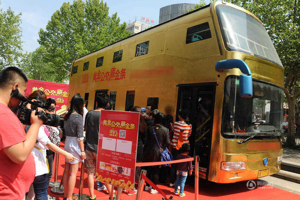 4月25日,一輛“黃金公交車”亮相山東濟(jì)南。據(jù)介紹,該公交車80%的部分都貼了金箔,“黃金美女”模特身上佩戴的黃金飾品價(jià)值兩百萬(wàn),公交車車內(nèi)掛滿了數(shù)千件黃金飾品,重達(dá)幾十公斤,總共價(jià)值500余萬(wàn)。(來(lái)源:騰訊新聞 陳寧/CFP)