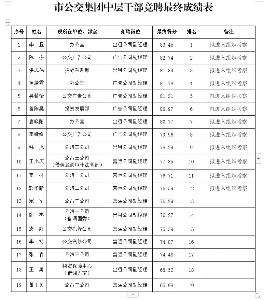 市公交集團(tuán)中層干部競(jìng)聘最終成績(jī)公示