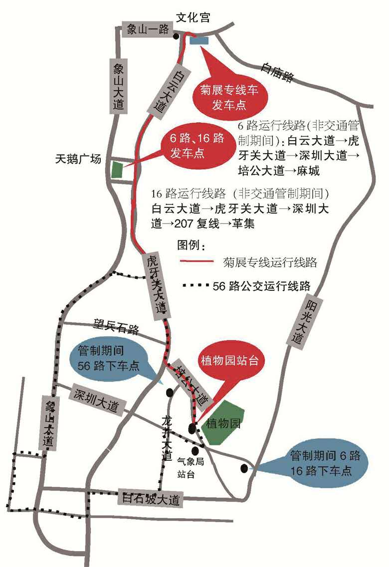 值得說(shuō)明的是,菊展期間,公交按現(xiàn)行票價(jià)收費(fèi)。菊展前三天,深圳大道東端、培公大道(培公大道與龍井大道交叉路口至培公大道與白石坡大道交叉路口)將實(shí)現(xiàn)交通管制,禁止公交車通行,這樣一來(lái),上述四條公交在植物園附近的線路和停靠站點(diǎn)將同步調(diào)整,菊展專線公交車將??吭谂喙蟮乐参飯@出口,其他時(shí)間??吭谥参飯@大門附近的植物園站臺(tái)。交通管制期間,16路公交車、6路公交車將??吭诎资麓蟮罇|上下車。56路交通管制期間線路不延伸,在培公大道與龍井大道交叉路口上龍井大道,游客可在龍井大道北段上下。荊門晚報(bào)訊(記者戴永君)