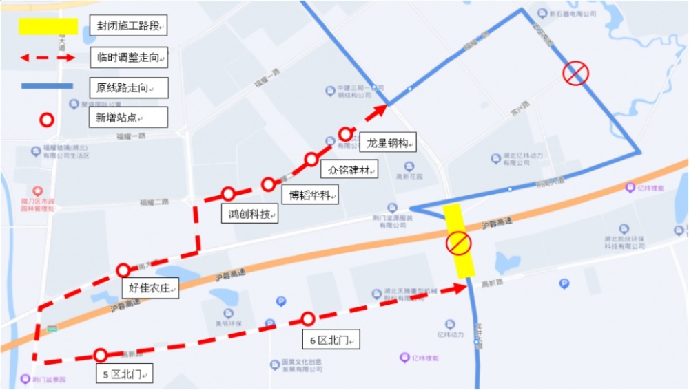 原途經(jīng)龍井大道—福耀二路—楊樹(shù)港路—荊南大道—龍井大道調(diào)整為龍井大道—福耀二路—福耀路—荊南大道—交通路—高新路—龍井大道